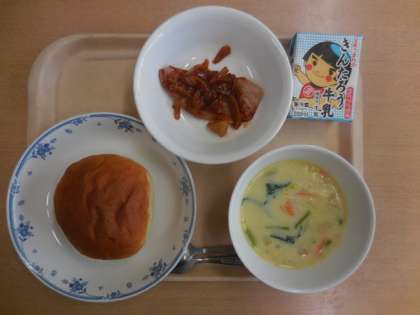 牛乳、チーズパン、ぶた肉のケチャップソースがけ、コーンクリームスープ
