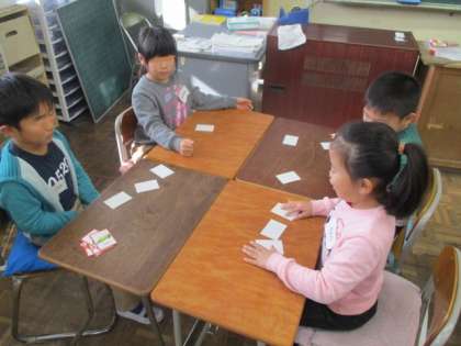 今日はALTの先生による外国語活動がありました。挨拶の仕方を練習した後、いくつかの食べ物を、果物(イチゴ、バナナ、オレンジ、レモン)と野菜(トウモロコシ、トマト、ニンジン、ジャガイモ)に分けて単語の発音練習をしました。子どもたちは、先生の発音をよく聞いて上手に話すことができていました。最後には、習った食べ物の絵を使って神経衰弱を楽しみました。