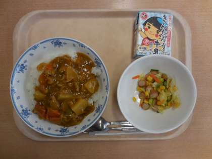 牛乳、米粉カレーライス、カラフルソテー (686キロカロリー)