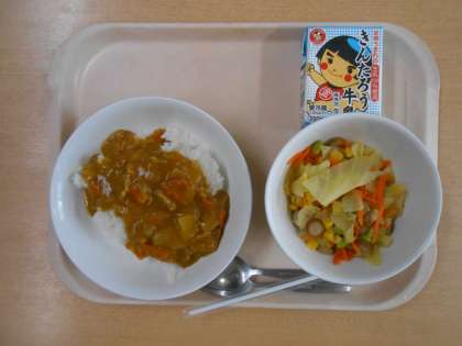 牛乳、カレーライス、カラフルソテー (702キロカロリー)