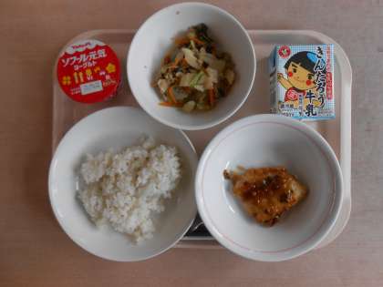 牛乳、麦入りごはん、揚げどりのねぎソースがけ、小松菜とキャベツのごま炒め、ヨーグルト