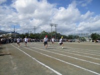 プログラム6番、2年生による「パワーアップ50m走」です。昨年に比べ、走り方に...
