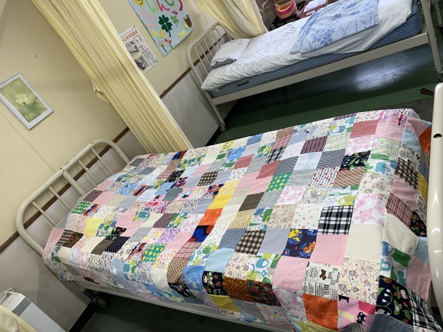 縫い物ボランティアさんが布の端切れをパッチワークし、大きなベッドカバーを作ってくださいました。カラフルで可愛いカバーの完成です!