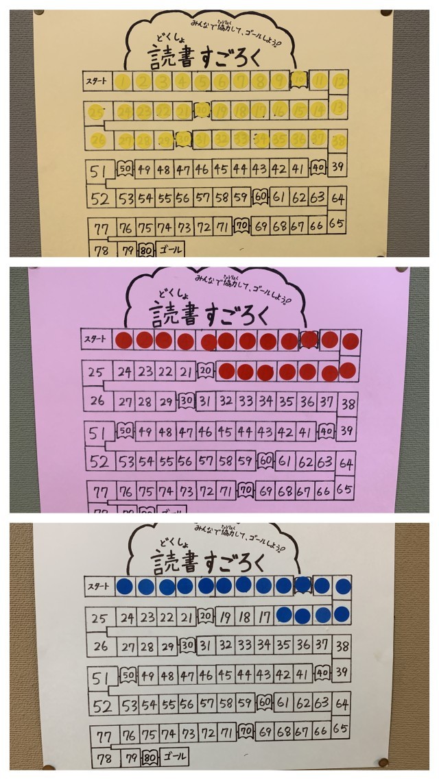 月曜日にスタートし、図書室に足を運ぶ子が増えてきました!すごろくもゴールに向かって着々と進んでいます。