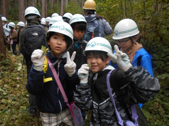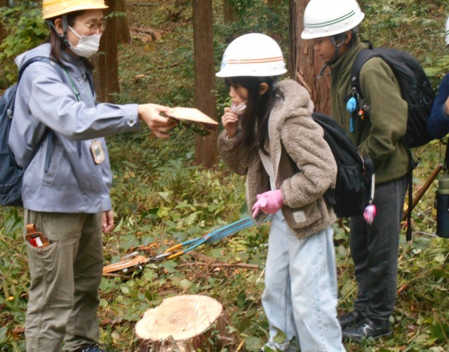 子どもたちは、自然林と人工林の違いをよく見たり、ヒノキとスギのにおい比べをしたり、時には職員の方から手渡された山椒の実をかじってみたり、と、五感をフル活用して楽しんでいました。