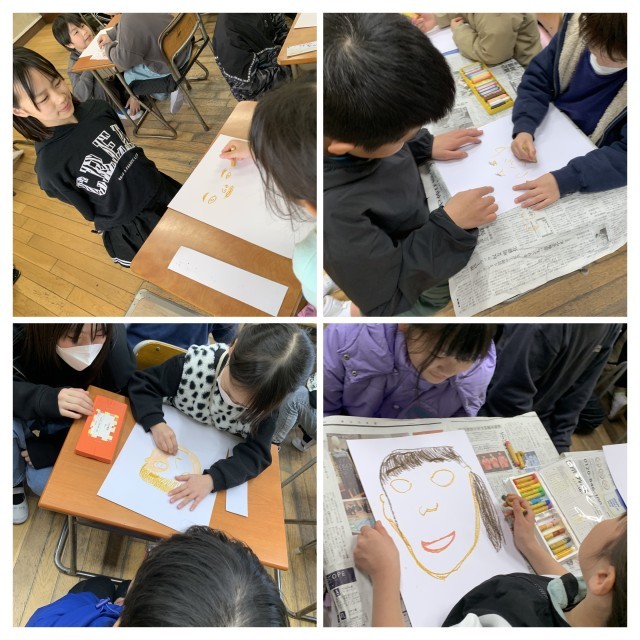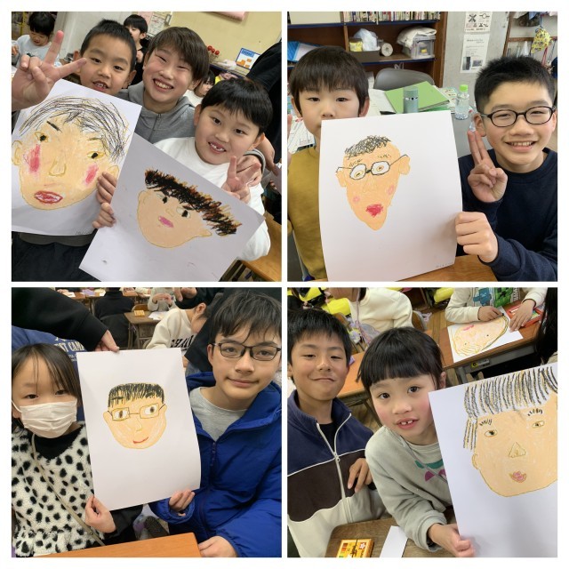 ちょっと緊張しつつも優しい笑顔で似顔絵のモデルをする6年生。「この辺に描いてごらん」「次は鼻だよ」「めっちゃ上手!」と、アドバイスしたり、褒めたり…優しく温かい時間でした。