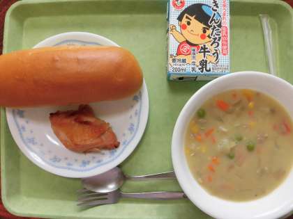 2月28日(水) 今日の給食 公開日 2018/02/28 更新日 2018/02/28 給食 献立 ・牛乳 ・黒パン ・鶏肉のレモンしょうゆ焼き ・クラムチャウダー 鶏肉のレモンしょうゆ焼きは今月の給食だよりに作り方を載せているので、良かったらご家庭でも作ってみてください。 クラムチャウダーは初めて出しました。アサリのむき身が入っています。アサリが苦手で除けて食べている子もいましたが、美味しいとおかわりしてくれる子もいました。 いいね(0)