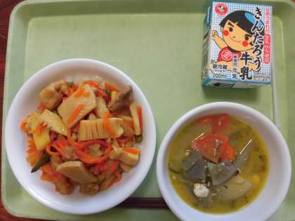 たけのこごはんには、彩りにいんげんが入っています。今日のいんげんは比較的よく食べていました。