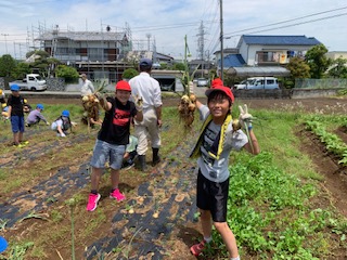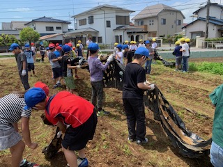 秋に植えたタマネギを収穫しました。マルチの片付けまで頑張りました。タマネギが何の料理になるのか楽しみです。