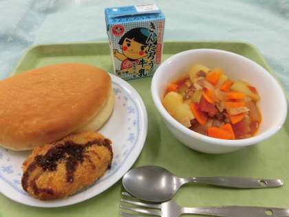 今日の献立 牛乳 ミートコロッケサンド ミックスビーンズのトマトスープ