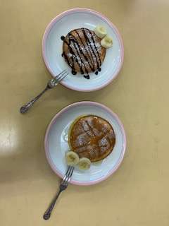 今年度最初に作ったのは、子どもたちの希望が一番多かったパンケーキ。メレンゲを作り、ふわふわパンケーキをめざしました。できあがったパンケーキは、思い思いに盛りつけ、いただきました。