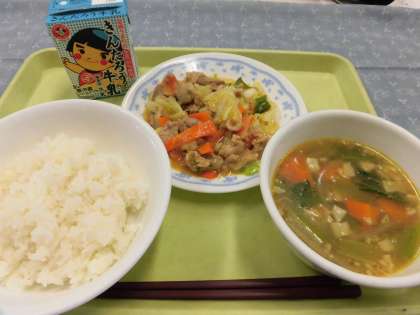 今日の献立 牛乳 ご飯 回鍋肉 中華スープ